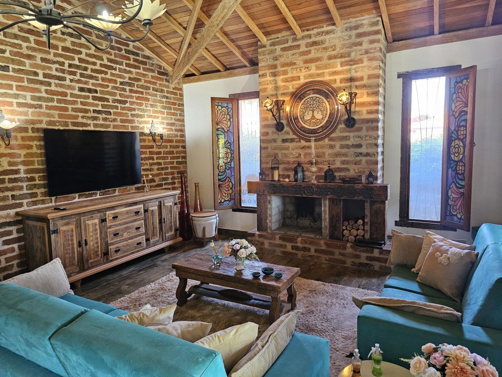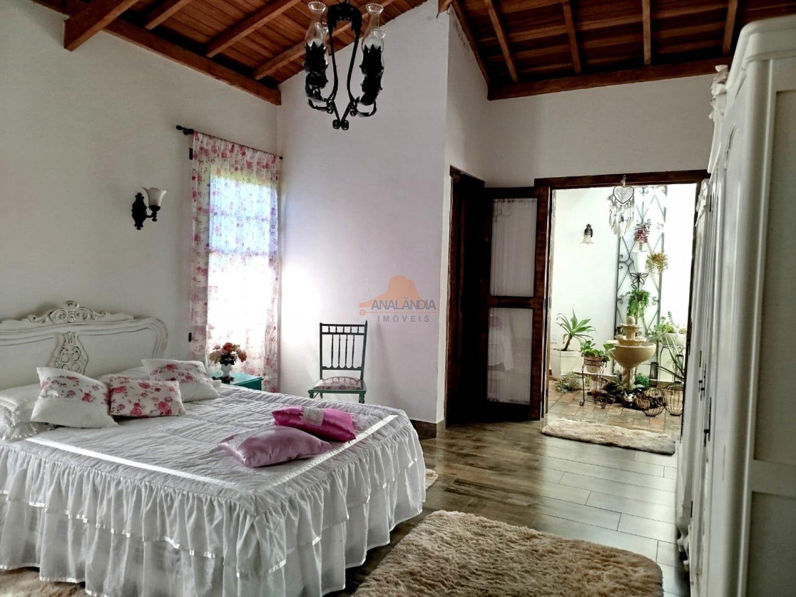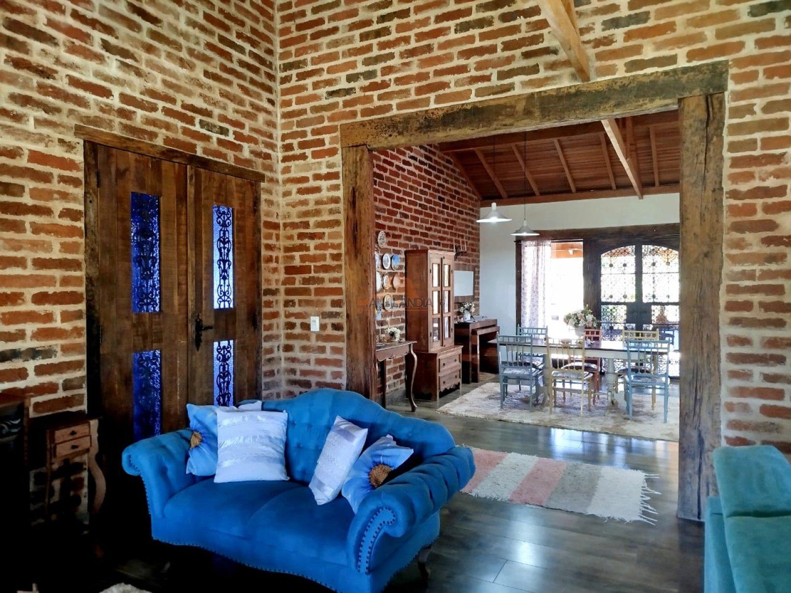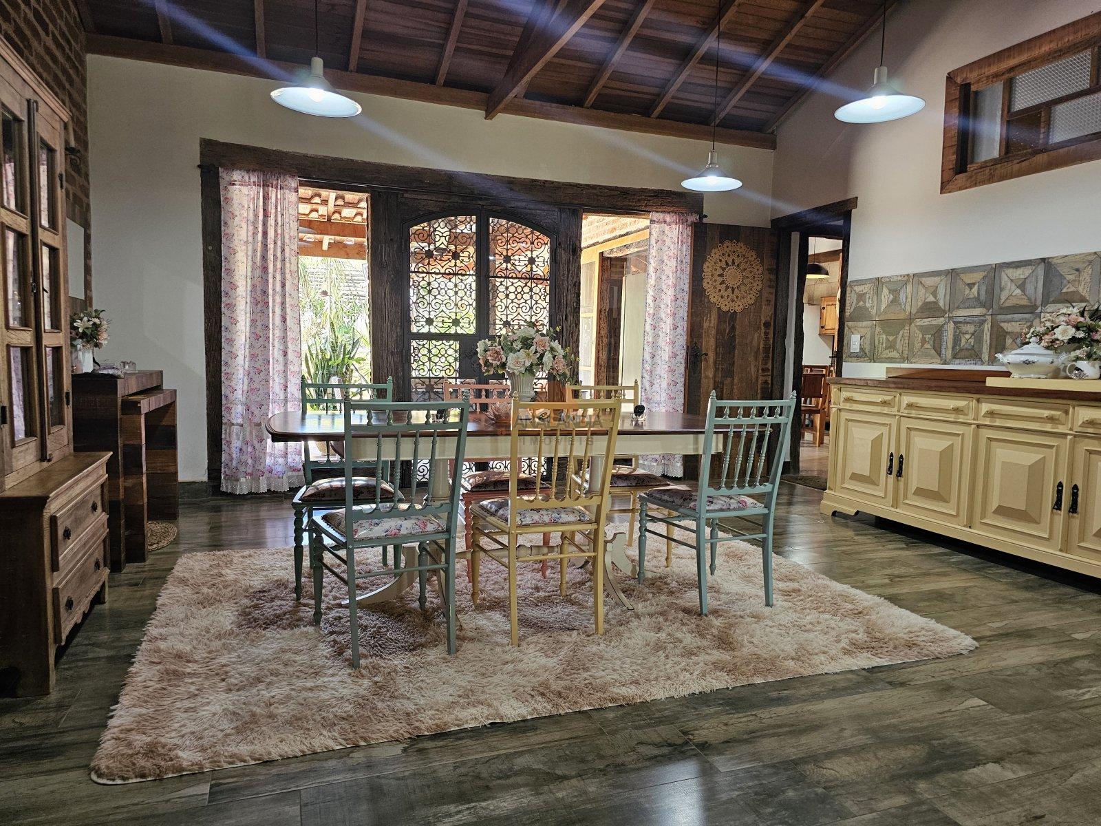 Suíte grande com jardim de inverno, 2 quartos, banheiro social, sala grande com dois ambientes com lareira, sala de jantar grande, cozinha grande, lavanderia, área gourmet com churrasqueira, banheiro anexo à área gourmet, quintal com jardim suspenso, área gramada na frente, jardins e varandas na frente e fundos, depósito na área externa.